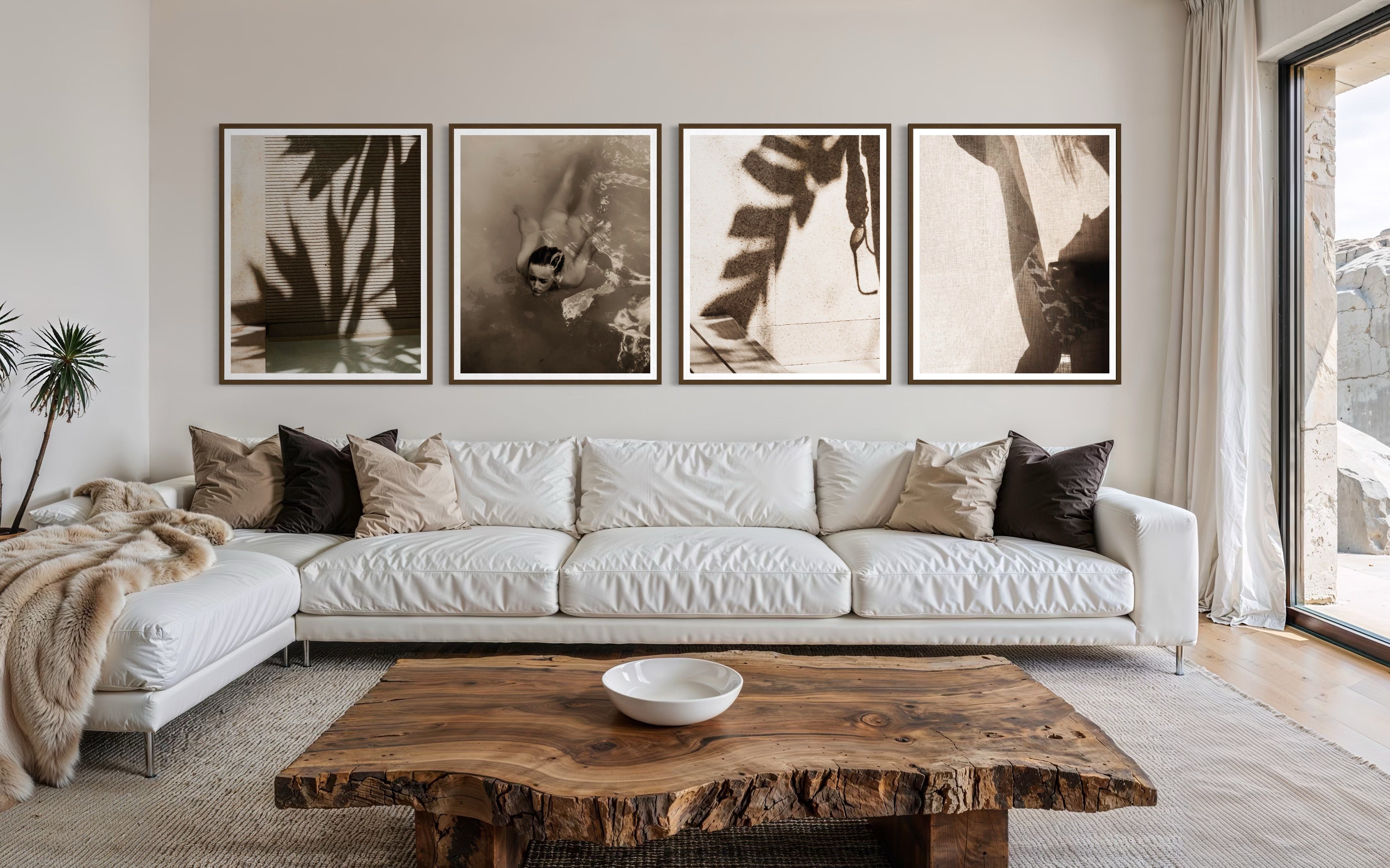 Each image rests in the space between presence and dissolution: a figure suspended beneath the surface; sunlight veiled through cloth; shadows blooming across warm stone; palms leaning into a quiet horizon. These scenes are not anchored to narrative, but to sensation-the hush of a slow afternoon, the shimmer of water folding over skin, the light that lingers after everything else has moved on.